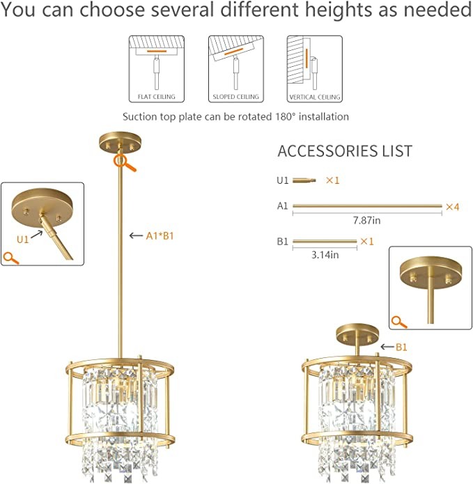 LMQNINE Dining Room Lighting Semi Recessed Ceiling Lighting Lndustrial Farmhouse Chandelier Gold Metal Crystal Chandelier for Hallway Entrance Bedroom Balcony Kitchen Island (3 Lights)