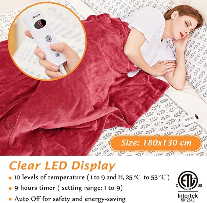 Mia&Coco electric blanket throwing flannel Sherpa fast heating 180x130cm, 10 speed heating level and up to 9 hours automatic off timer and LED display, suitable for home office use, machine washable,