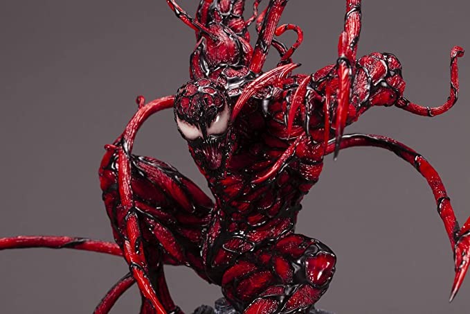 Kotobukiya Kotobukiya from Spider-Man's malicious and destructive carnage returns to the FINE ART STATUE series. The intense sculpting and detail on this creature's face has been replicated to the highest degree by cold casting, and has a level that far exceeds that of the last statue! The sharpened steel bows and arrows emerging from the body thoroughly reproduce Carnage's deadly symbiotic attack. These 5 traditional symbiotic figures can be interchanged to reproduce various shapes and poses. While the statue itself is already packed with punch, by using the included docking station, users can also attach an ARTFX Venom to this statue to recreate the battle between two symbiotes!