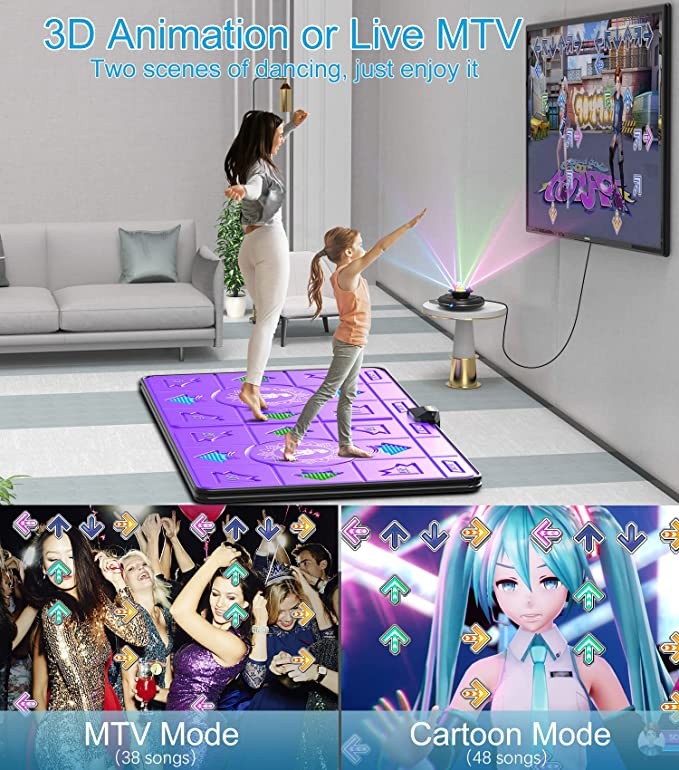 • 【Free Dance Socks & Easy to Install】 Free dance socks can improve the dance game experience. Device installation is very convenient and simple, just use HDMI to connect the host and TV. PU+EVA high quality non-polluting and harmless material to human body. The non-slip design of the rubber particles at the bottom of the dance mat makes it more secure. If you encounter any problems, please feel free to contact us via Amazon message and we will get back to you immediately.