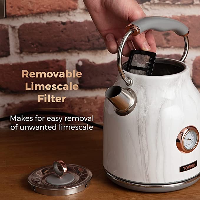 Tower Bottega T10020WMRG Traditional Kettle, Quick Boil, with Temperature Dial, Dry Out Protection, Automatic Shut Off, Silent, Stainless Steel, 3000 W, 1.7 L, Marble and Rose Gold